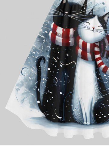 Plus Size Christmas Scarf Cat Lovers Print Vintage Swing A Line Dress - Black - Xs
