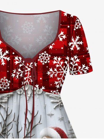 Plus Size Christmas Snata Claus Sled Elk Snowflake Flowers Plaid Print Cinched Dress - Red - M