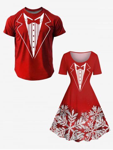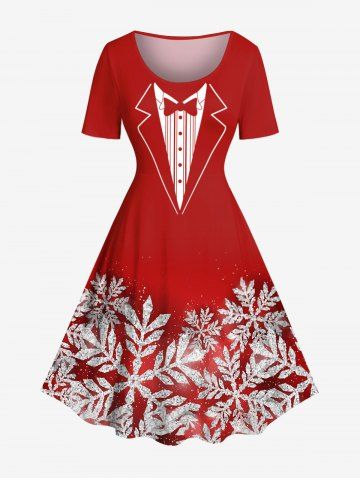 Plus Size Christmas Snowflake Bowknot Lapel Collar Print Vintage Dress - Red - 5x