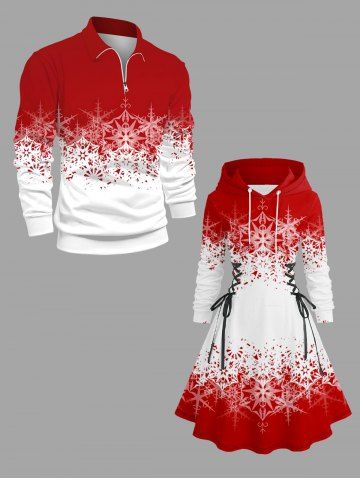 Plus Size Christmas Snowflake Colorblock Print Lace Up Drawstring Hoodie Dress - Red - M