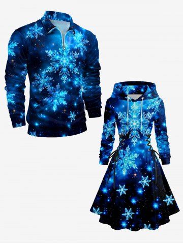 Plus Size Christmas Snowflake Galaxy Print Lace Up Drawstring Hoodie Dress - Sky Blue - M
