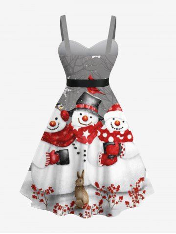 Plus Size Christmas Snowflake Snowman Rabbit Flower Print Button A Line Dress with Removable Belt - Gray - Xs