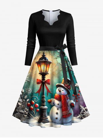 Plus Size Christmas Snowflake Snowman Street Lamp Print Ombre Scalloped Neck A Line Dress with Removable Belt - Black - M