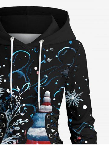 Plus Size Christmas Snowman Flowers Print Lace Up Drawstring Hoodie Dress - Black - Xs
