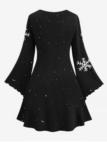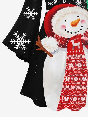 Plus Size Christmas Snowman Snowflake Bird Letters Printed Flare Sleeves Dress - Black - 2x