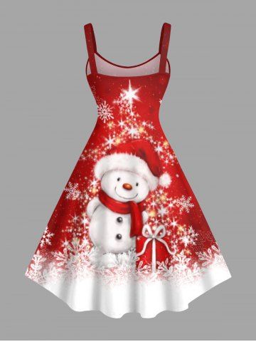 Plus Size Christmas Snowman Snowflake Gift Box Colorblock Glitter 3D Print Tank Dress - Red - 2x