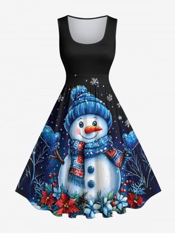 Plus Size Christmas Snowman Snowflake Holy Fruit Leaf Print 1950s Vintage Dress - Black - 2x