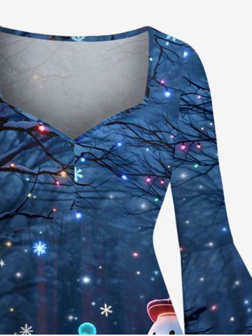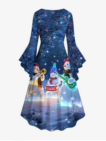 Plus Size Christmas Snowman Snowflake Musical Instrument Tree Print Flare Sleeves Ruched High Low Dress - Blue - M