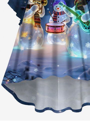 Plus Size Christmas Snowman Snowflake Musical Instrument Tree Print Flare Sleeves Ruched High Low Dress - Blue - 4x