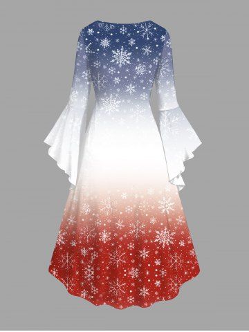 Dresses > Plus Size Christmas Snowman Snowflake Ombre Colorblock Print Cinched Flare Sleeves High Low Dress