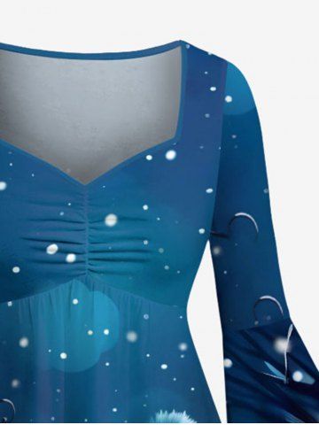 Plus Size Christmas Snowman Snowflake Tree Street Light Print Flare Sleeve Ruched High Low Dress - Sky Blue - Xs