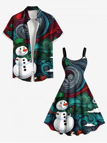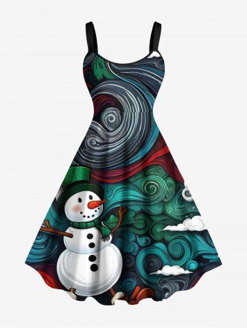 Plus Size Christmas Snowman Spiral Cloud Print A Line Dress - Green - S