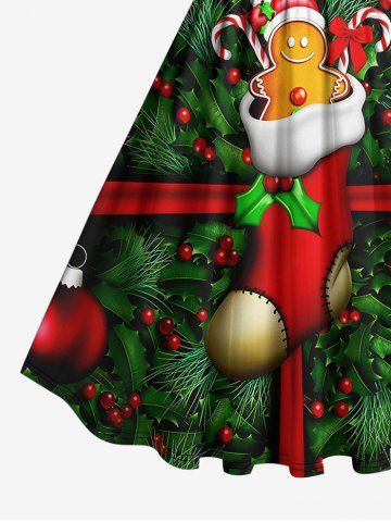 Plus Size Christmas Sock Holy Fruit Leaf Candy Gingerbread Print 1950s Vintage Dress - Black - 2x