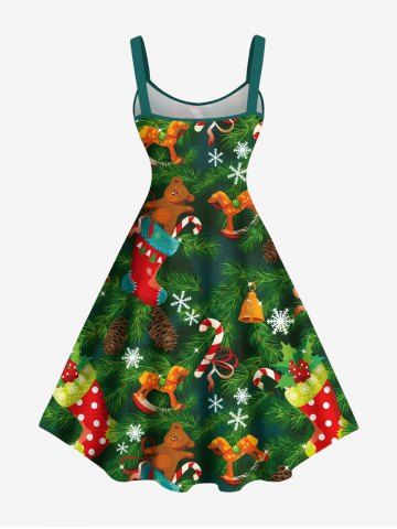Plus Size Christmas Stocking Bell Bear Candy Snowflake Print Tank Dress - Green - 1x