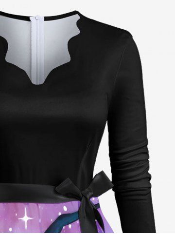 Dresses > Plus Size Christmas Stocking Wizard Light Galaxy Print Scalloped Neck A Line Dress with Tied Belt