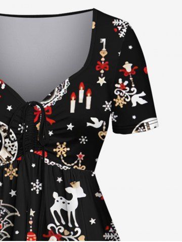 Plus Size Christmas Tree Ball Elk Candle Snowflake Moon Print Cinched Dress - Black - L