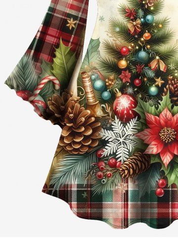 Dresses > Plus Size Christmas Tree Ball Floral Snowflake Pine Cones Plaid Print A Line Dress