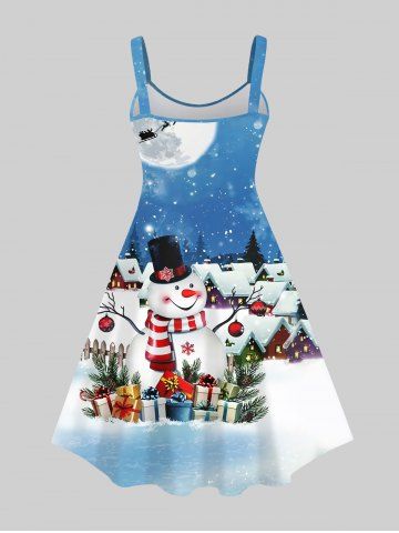 Plus Size Christmas Tree Ball Gift Snowman Snowflake Moon Print Tank Dress - Light Blue - 1x