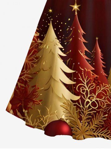 Dresses > Plus Size Christmas Tree Ball Leaf Print Scalloped Neck A Line Dress with Removable Belt
