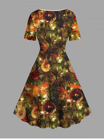 Plus Size Christmas Tree Ball Light Bowknot Buttons Print Vintage Dress - Light Brown - Xxs