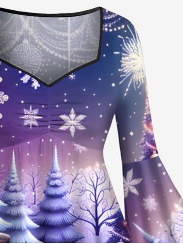 Plus Size Christmas Tree Ball Snowman Snowflake Gift Box Print Ruched Flare Sleeve High Low Dress - Purple - 2x