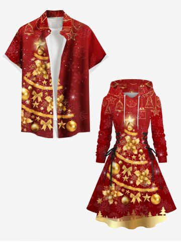 Plus Size Christmas Tree Bowknot Ball Bell Flowers Snowflake Print Lace Up Drawstring Hoodie Dress - Red - 6x