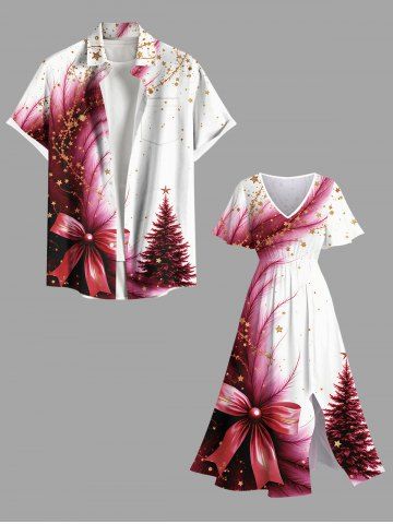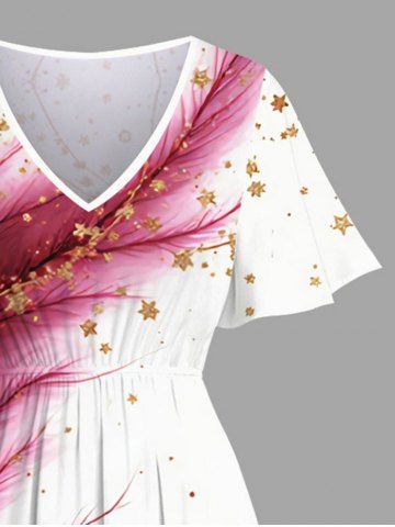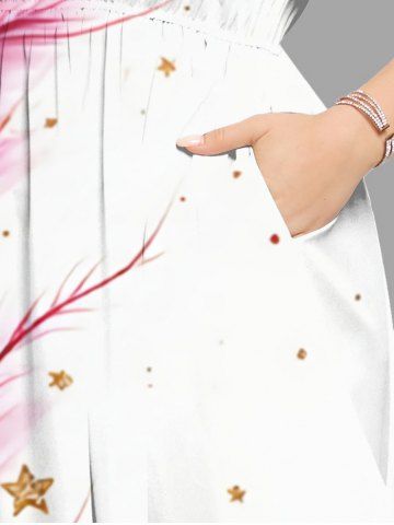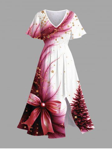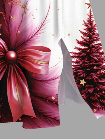 Plus Size Christmas Tree Bowknot Feather Stars Print Split Pocket A Line Midi Dress - White - 2x