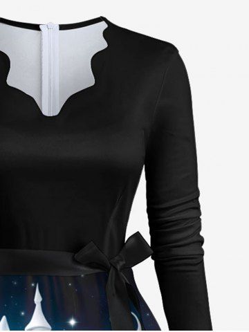 Plus Size Christmas Tree Castle Snow Stars Ombre Galaxy Print Scalloped Neck A Line Dress with Tied Belt - Multi-a - 4xl