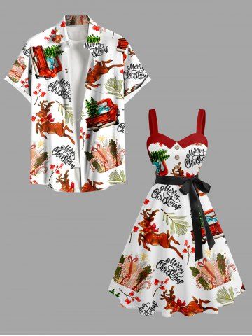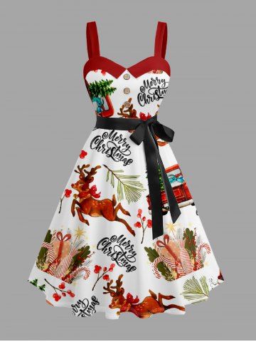 Plus Size Christmas Tree Elk Car Letters Print Button A Line Dress with Removable Belt - Red - 2x