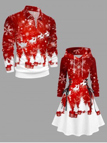 Plus Size Christmas Tree Elk Snowflake Print Lace Up Drawstring Hoodie Dress - Red - 3x