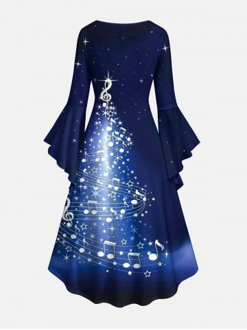 Plus Size Christmas Tree Galaxy Star Musical Notes Print Ruched Flare Sleeves High Low Dress - Navy Blue - L