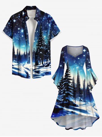 Dresses > Plus Size Christmas Tree Galaxy Star Print Ruched Flare Sleeves High Low Dress