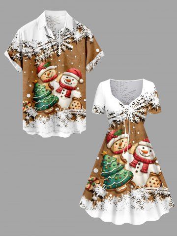 Plus Size Christmas Tree Gingerbread Snowflake Snowman Print Cinched Dress - Light Brown - M