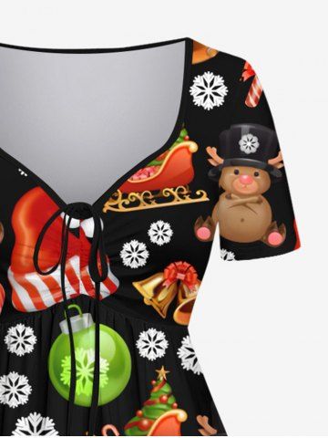 Plus Size Christmas Tree Hat Bear Ball Candy Snowflake Sled Print Cinched Dress - Black - 3x