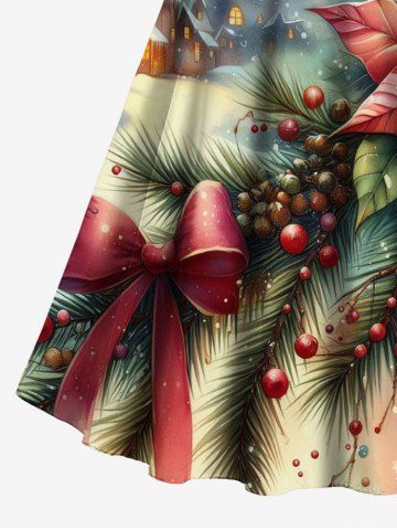 Dresses > Plus Size Christmas Tree Holly Bowknot Leaf House Snow Print Ombre Scalloped Neck A Line Dress with Tied Belt