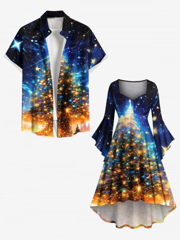 Plus Size Christmas Tree Light Glitter 3D Print Ruched Flare Sleeve High Low Dress - Navy Blue - 2x