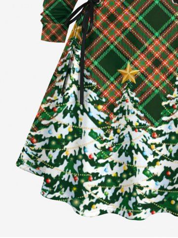 Plus Size Christmas Tree Plaid Print Lace Up Hooded A Line Dress - Olive Green - 6x