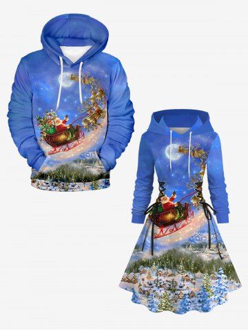 Plus Size Christmas Tree Santa Claus Elk Sled Galaxy Print Lace Up Drawstring Hoodie Dress - Sky Blue - 1x