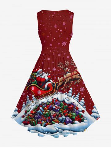 Plus Size Christmas Tree Santa Claus Elk Snowflake Gift Box Print 1950s Vintage Dress - Deep Red - L