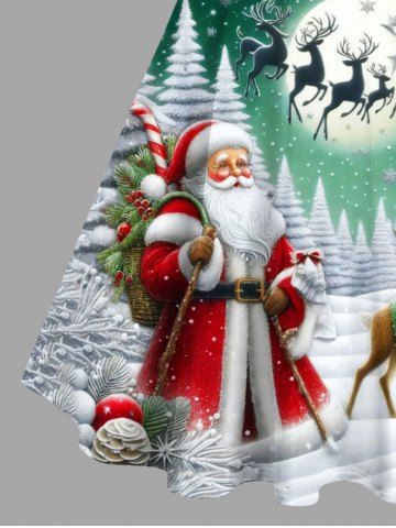 Plus Size Christmas Tree Santa Claus Elk Snowflake Print Buttons Turn Down Collar Dress With Belt - Green - 5x