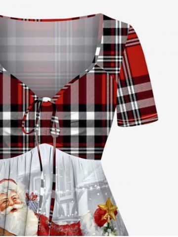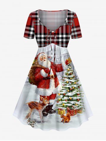 Plus Size Christmas Tree Santa Claus Elk Squirrel Plaid Print Cinched Dress - White - 1x