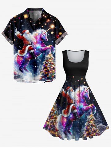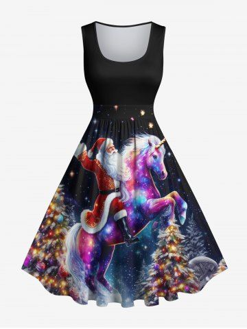 Plus Size Christmas Tree Santa Claus Unicorn Glitter Star Galaxy Print Vintage Swing A Line Dress - Black - 1x