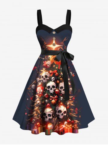 Plus Size Christmas Tree Skull Print Button A Line Dress with Removable Belt - Black - 1x