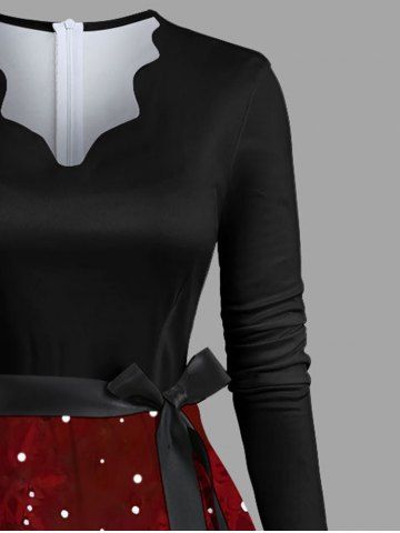 Plus Size Christmas Tree Snow Print Scalloped Neck A Line Dress with Tied Belt - Black - Xl