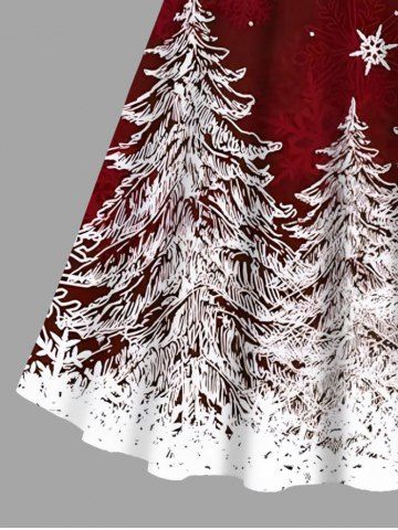Dresses > Plus Size Christmas Tree Snow Print Scalloped Neck A Line Dress with Tied Belt
