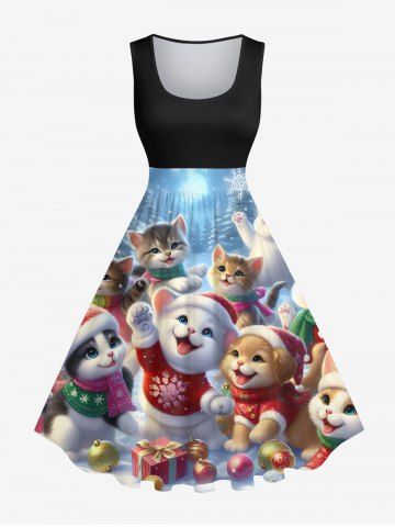 Plus Size Christmas Tree Snowflake Glitter Galaxy Cute Cat Print Vintage Swing A Line Dress - Black - M