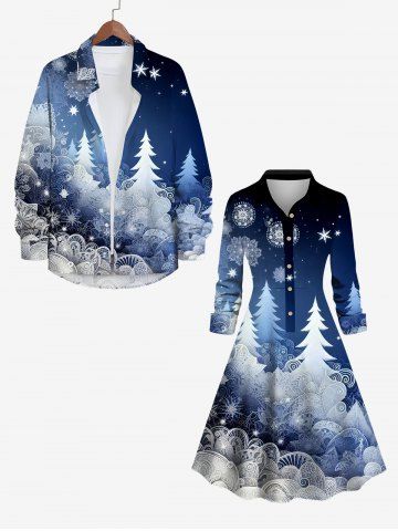 Dresses > Plus Size Christmas Tree Snowflake Ombre Galaxy Print Half Button A Line Shirted Dress