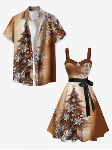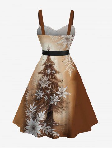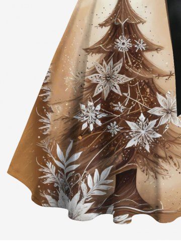 Plus Size Christmas Tree Snowflake Ombre Print Button A Line Dress with Removable Belt - Light Brown - S
