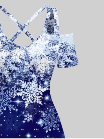 Plus Size Christmas Tree Snowflake Print Cold Shoulder Crisscross Maxi Dress - Blue - 1x