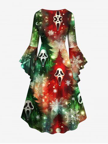 Plus Size Christmas Tree Snowflake Skull Print Ombre Ruched High Low Asymmetric Dress - Red - 1x